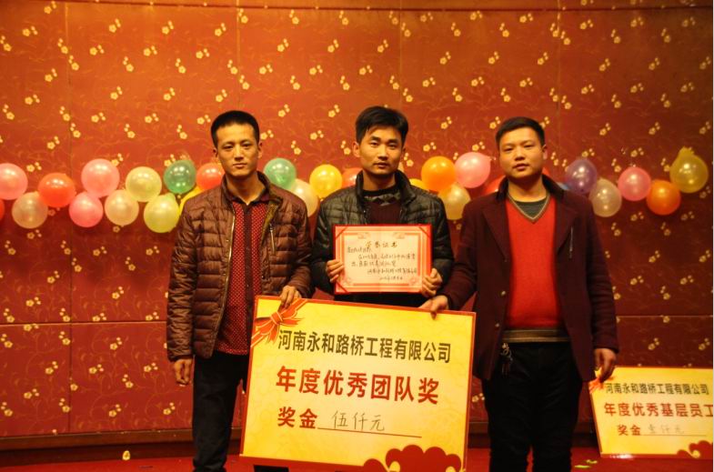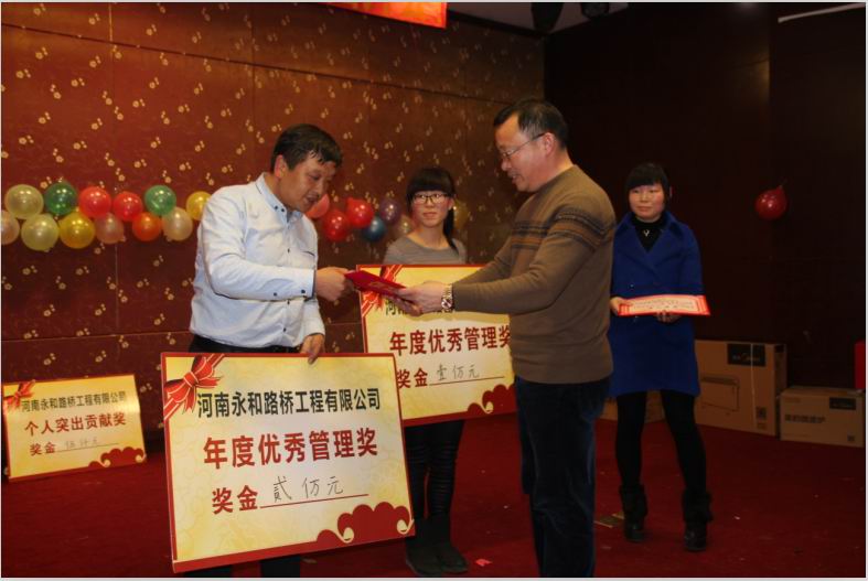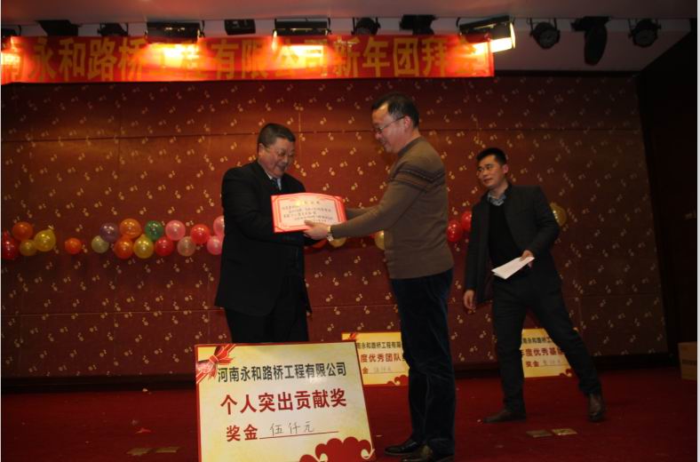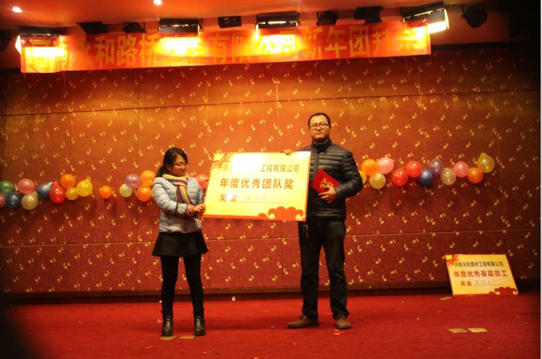 2016年2月4日晚,農(nóng)歷臘月26日晚,河南永和路橋工程有限公司在信陽市五星 級酒店中樂百花酒店隆重的舉行了2016年新春團拜會,本次團拜會由公司全體員工及家屬、公司的合作伙伴、朋友等共同出席,大家歡聚一堂、把酒言歡、其樂融融。公司董事長孔總發(fā)表新年賀詞比代表公司對年度優(yōu) 秀個人及團隊進行了表彰。公司還為到場的每位小寶寶送上新年祝福和紅包,并準備了抽獎環(huán)節(jié)。大家歡歌笑語,一直將熱鬧、愉快的氛圍維持到午夜。圖為團拜會期間頒獎儀式