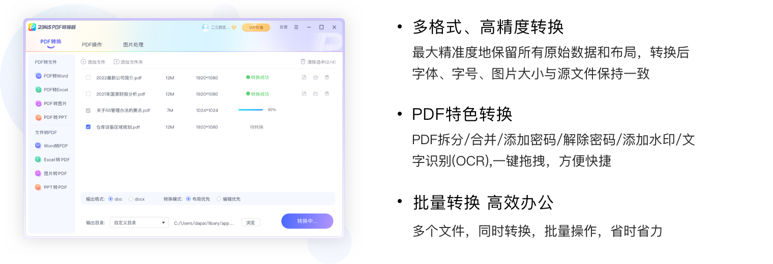 輕巧、方便、快捷、安全2345PDF轉(zhuǎn)換器,是一款功能強(qiáng)大、操作簡(jiǎn)單的PDF轉(zhuǎn)換軟件,支持PDF文檔和Word、PPT、Excel、圖片等文檔多種格式之間的互轉(zhuǎn);同時(shí)支持PDF拆分、PDF合并、PDF添加和解除密碼、圖片處理以及OCR文字識(shí)別等功能。文件轉(zhuǎn)換格式豐富、轉(zhuǎn)換質(zhì)量好、產(chǎn)品界面操作便捷,是新一代文件格式轉(zhuǎn)換工具。 了解更多