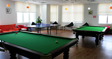 邊線 休閑中心公司在辦公區(qū)域設(shè)立了員工休閑中心,休閑中心內(nèi)有臺球桌、乒乓球桌、桌上足球等一系列玩樂設(shè)施,滿足了大家在午休和下班時(shí)間的休閑放松。