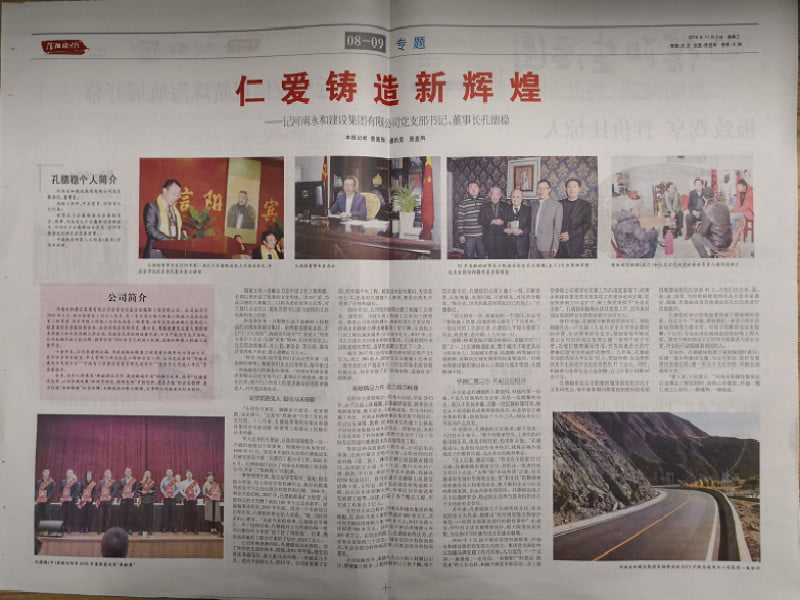 2018年11月7日,《信陽晚報》刊發(fā)了對河南永和建設(shè)集團有限公司黨支部書記、董事長孔德穩(wěn)的相關(guān)專訪內(nèi)容,文章對于孔德穩(wěn)的創(chuàng)業(yè)之路、經(jīng)營之道、踐行企業(yè)社會責(zé)任之舉以及弘揚傳統(tǒng)文化之策進(jìn)行了深刻剖析。